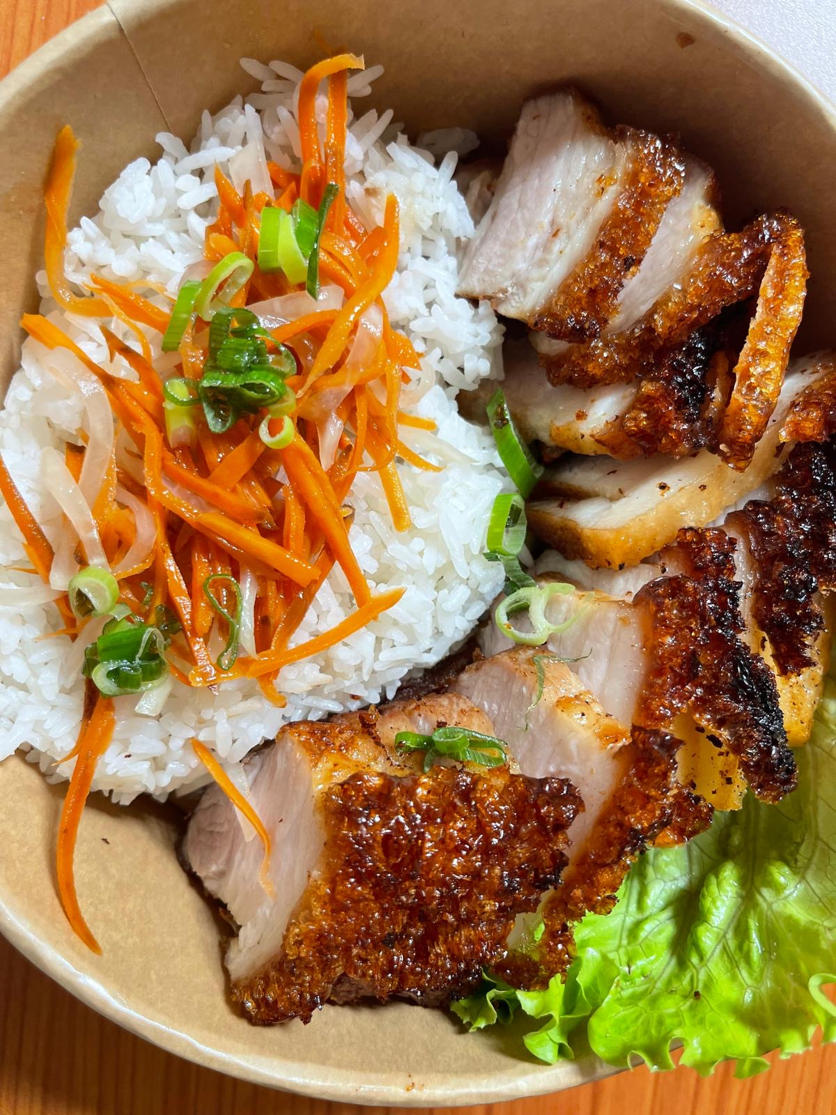 Poitrine de porc à la couenne croustillante et riz blanc ou riz vermicelles et ses pickles de légumes acidulés